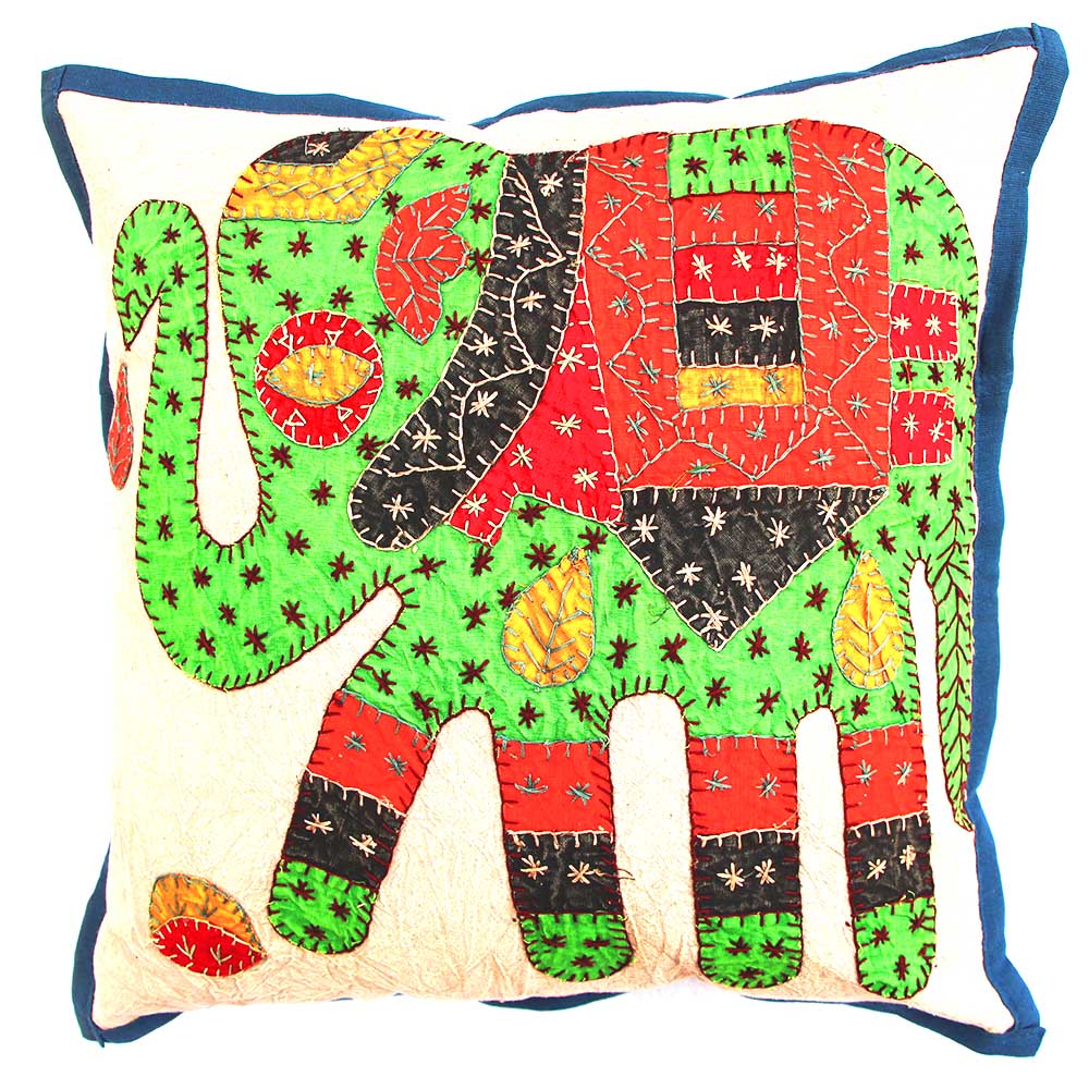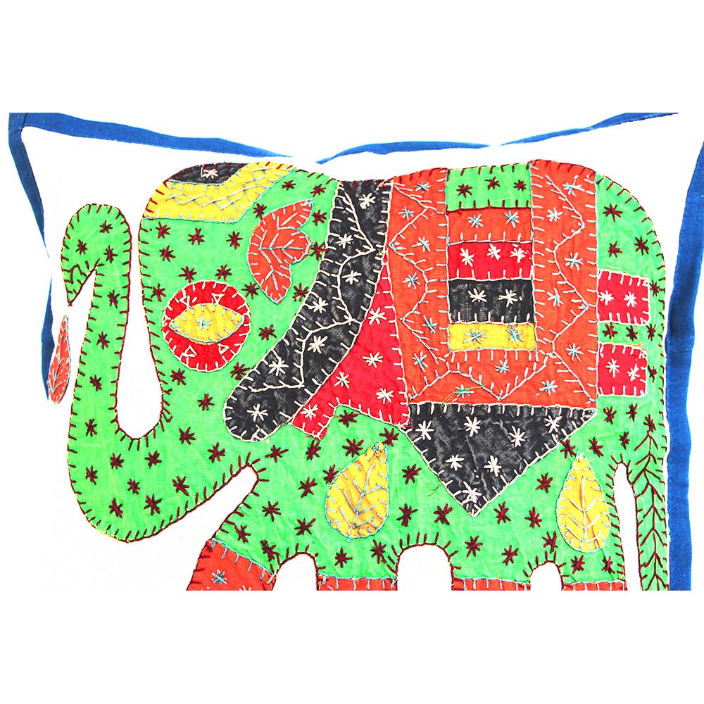 Elevate your home decor with timeless elegance through this majestic Barmer applique work cushion cover white, a stunning handcrafted masterpiece featuring intricate elephant design embroidery and patchwork by skilled artisans from Barmer, Rajasthan. Set against a pristine white cotton base, the bold applique elephants—symbols of strength, wisdom, and prosperity in Indian culture—are meticulously layered and stitched with colorful fabric patches, outlined in fine embroidery for a textured, multidimensional effect that captures the essence of traditional Rajasthani craftsmanship.