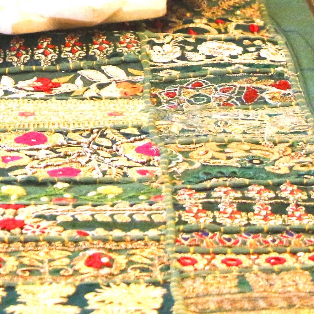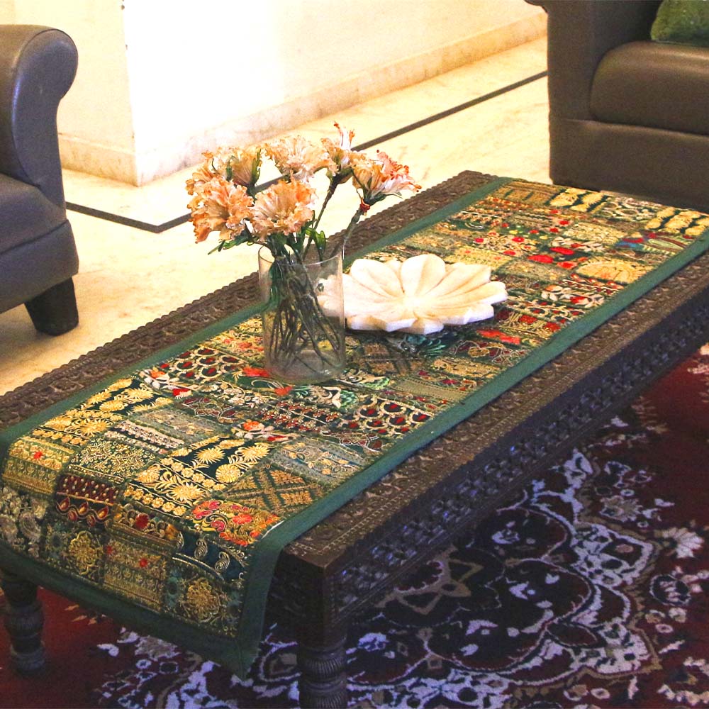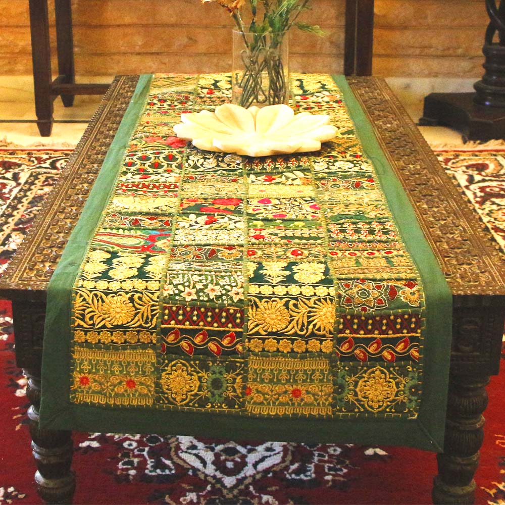 Refreshing Green Barmer Table Runner – Handcrafted Khambadiya Patchwork Cotton with Flower and Leaf Embroidery