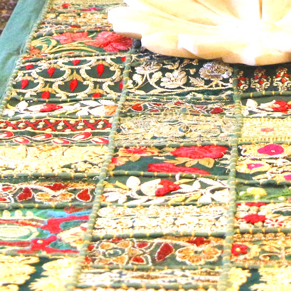 According to the Asia InCH Encyclopedia of Intangible Cultural Heritage, appliqué in Barmer involves sewing smaller fabric pieces onto a larger base to form intricate patterns. Artisans often incorporate mirrors, sequins, and dense embroidery for added sparkle, though this classic Barmer table runner focuses on pure floral elegance.