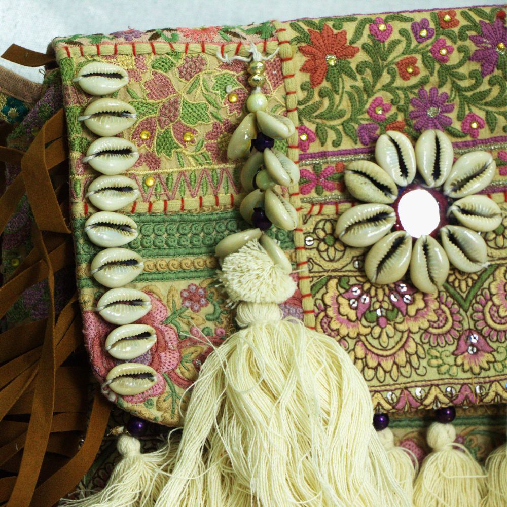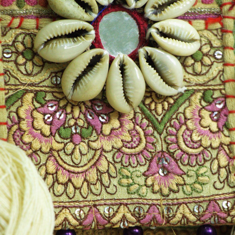 Material: Old recycled fabric with embroidery, kodi (cowrie shells), cotton & khadi lining