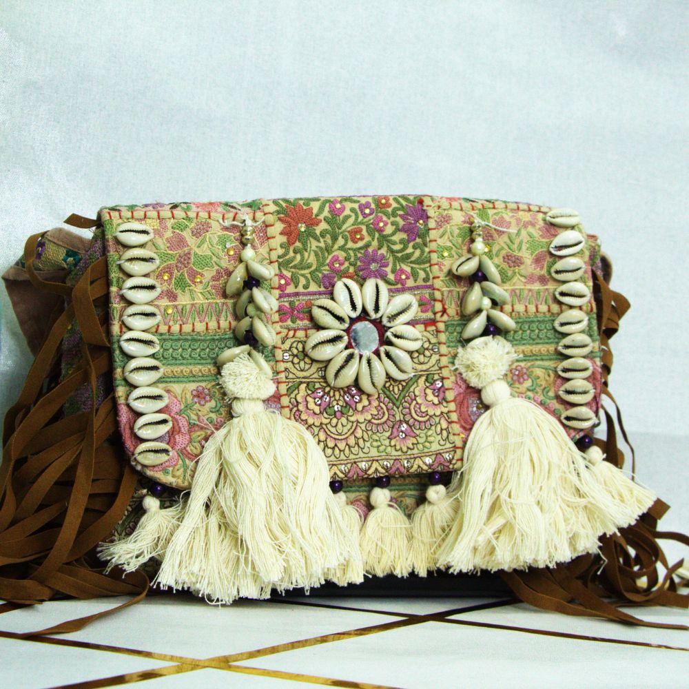 A rare confluence of tradition and luxury, the Heritage Royale Khambadiya Bag is more than an accessory – it is a timeless collectible. 🌿 Crafted by hand using upcycled vintage fabrics, this bag carries the legacy of India’s textile traditions into the modern era. The surface is richly decorated with floral embroidery , kodi (cowrie shell) embellishments , and ornate tassel accents , giving it a regal charm.