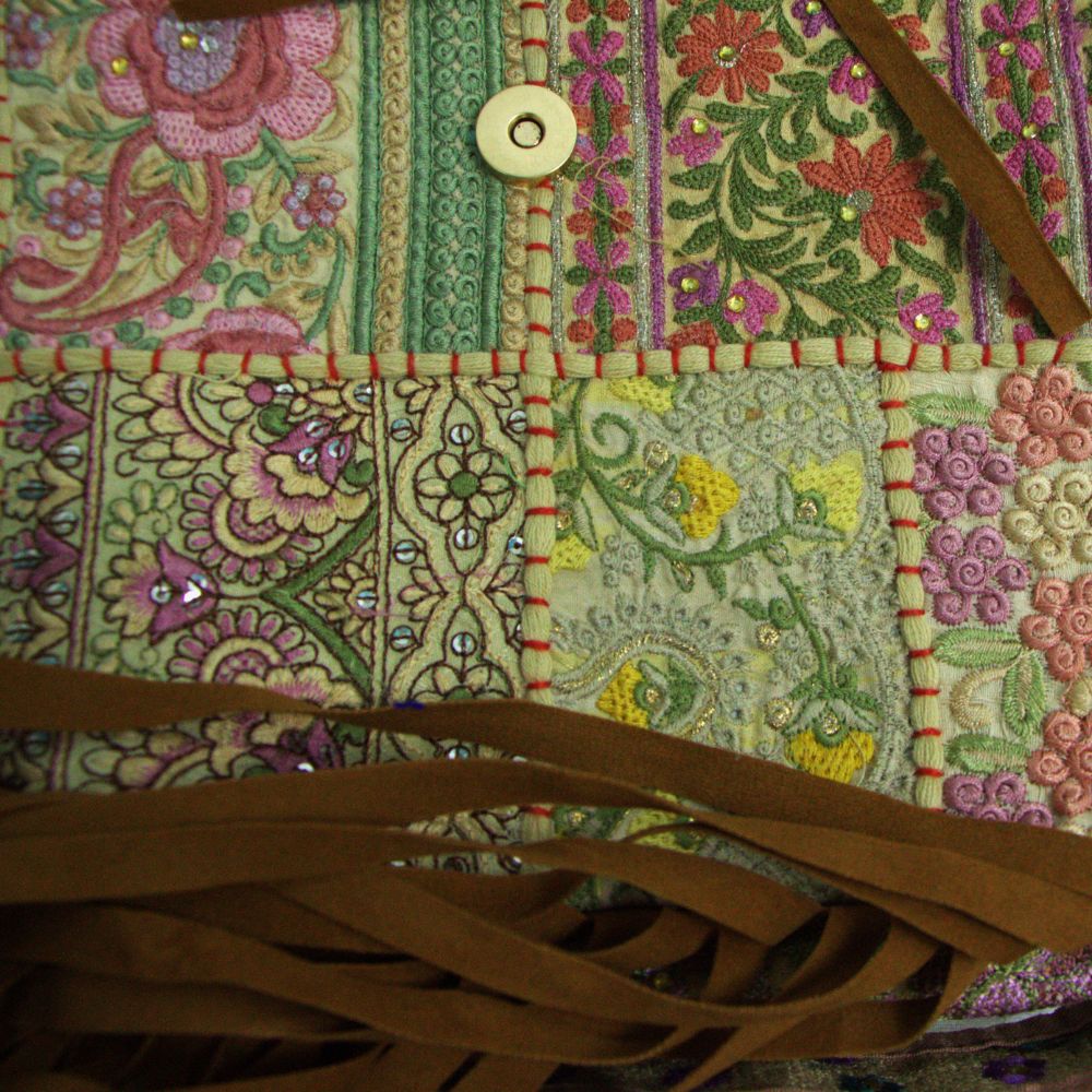 Inside, the bag is lined with beige cotton & khadi fabric, offering both softness and durability . The dual zipper compartments and magnetic flap closure blend artisanal beauty with everyday practicality. The fixed embroidered strap and fringe tassels enhance its boho-luxe appeal, while its sturdy construction allows it to carry up to 5 kg .