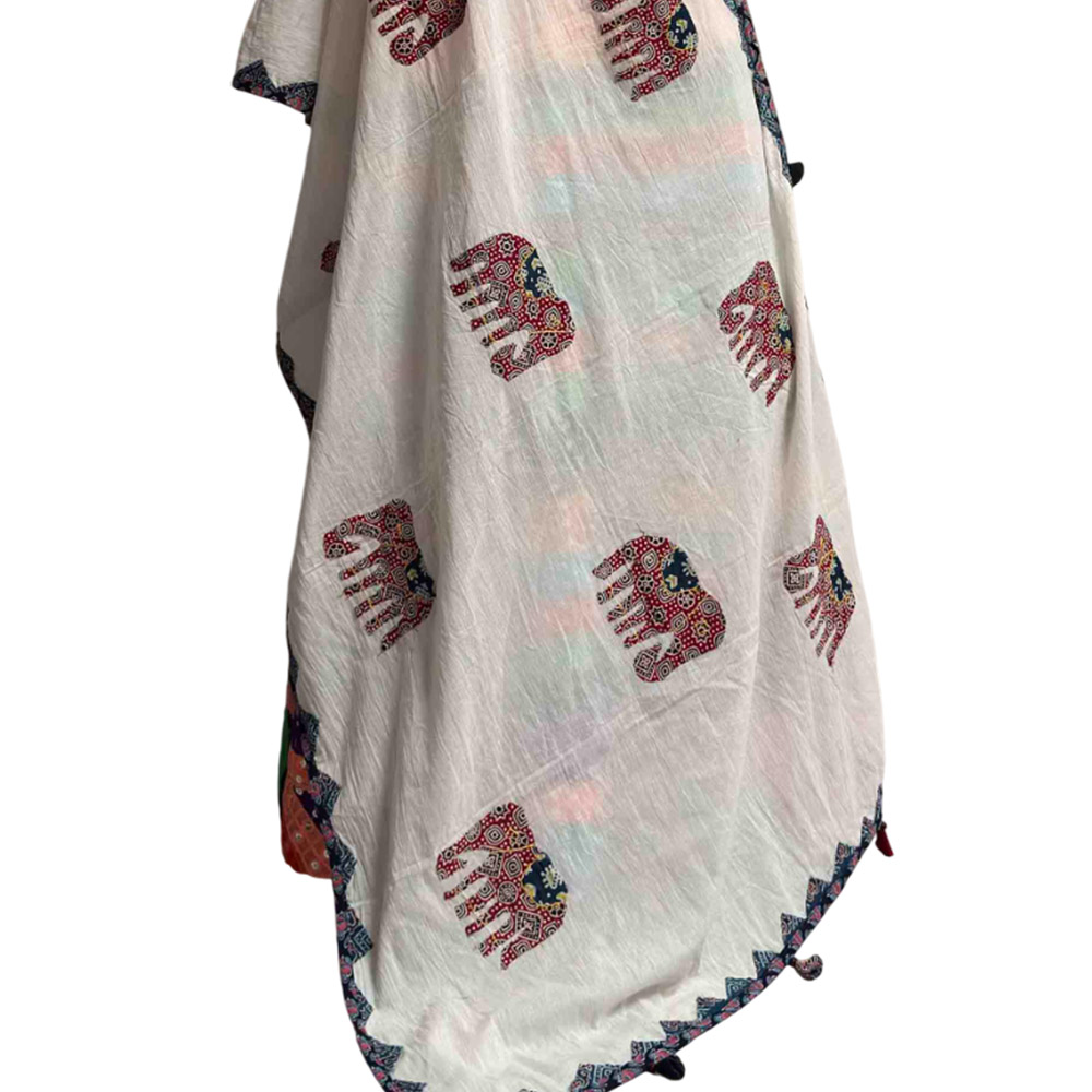 The applique dupatta embodies graceful heritage and modern charm. This premium off-white cotton piece showcases intricate elephant applique motifs, hand-cut and stitched by artisans on high-quality 60×60 thread count fabric for a textured, timeless ethnic accessory.