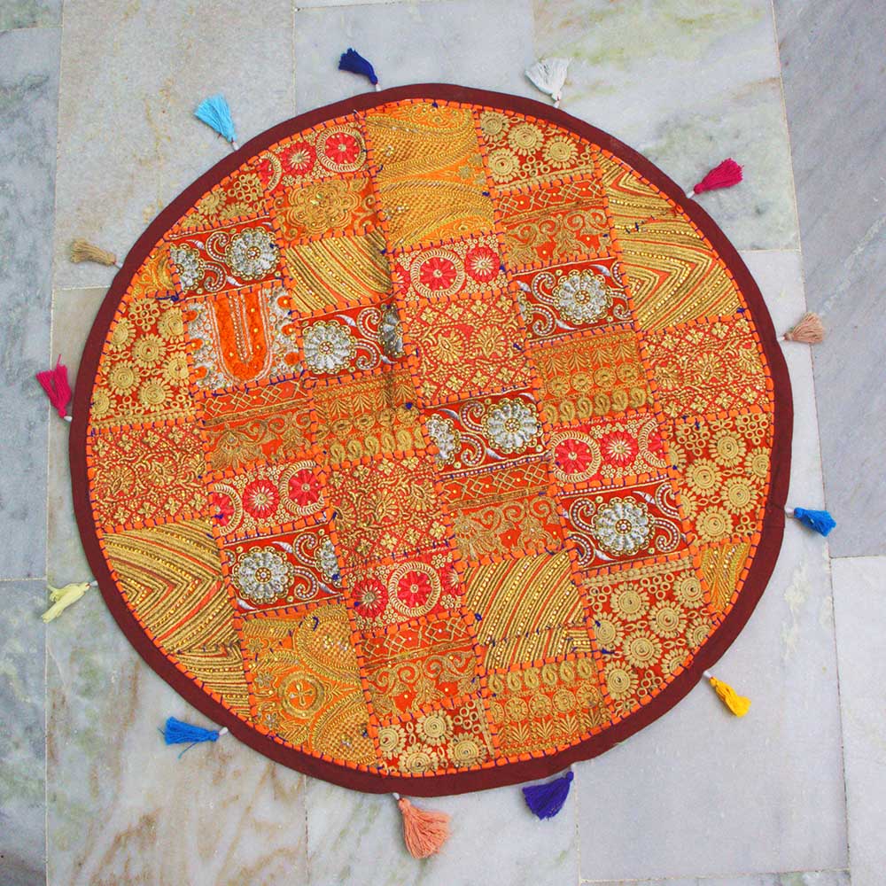 Stunning Multi Color and Orange Barmer round table runner designs capture the timeless beauty of Rajasthan’s desert artisanship, infusing your home with vibrant cultural elegance and serene green hues. This exquisite handcrafted piece highlights the legendary Barmer embroidery tradition, where lush greens symbolize growth, harmony, and the refreshing oases amid arid landscapes.Skilled artisans handcraft this stunning Barmer round table runner from premium cotton fabric, delivering a soft, durable, and breathable surface ideal for everyday use. The round patchwork construction seamlessly joins fabric pieces in a symmetrical pattern, with each section featuring detailed hand embroidery of blooming flowers, graceful leaves, flowing vines, and intricate motifs. Dominant emerald and forest greens blend with accents of gold, teal, cream, and subtle pops of color, bordered by a rich edge and completed with colorful tassels that add playful movement and bohemian flair.