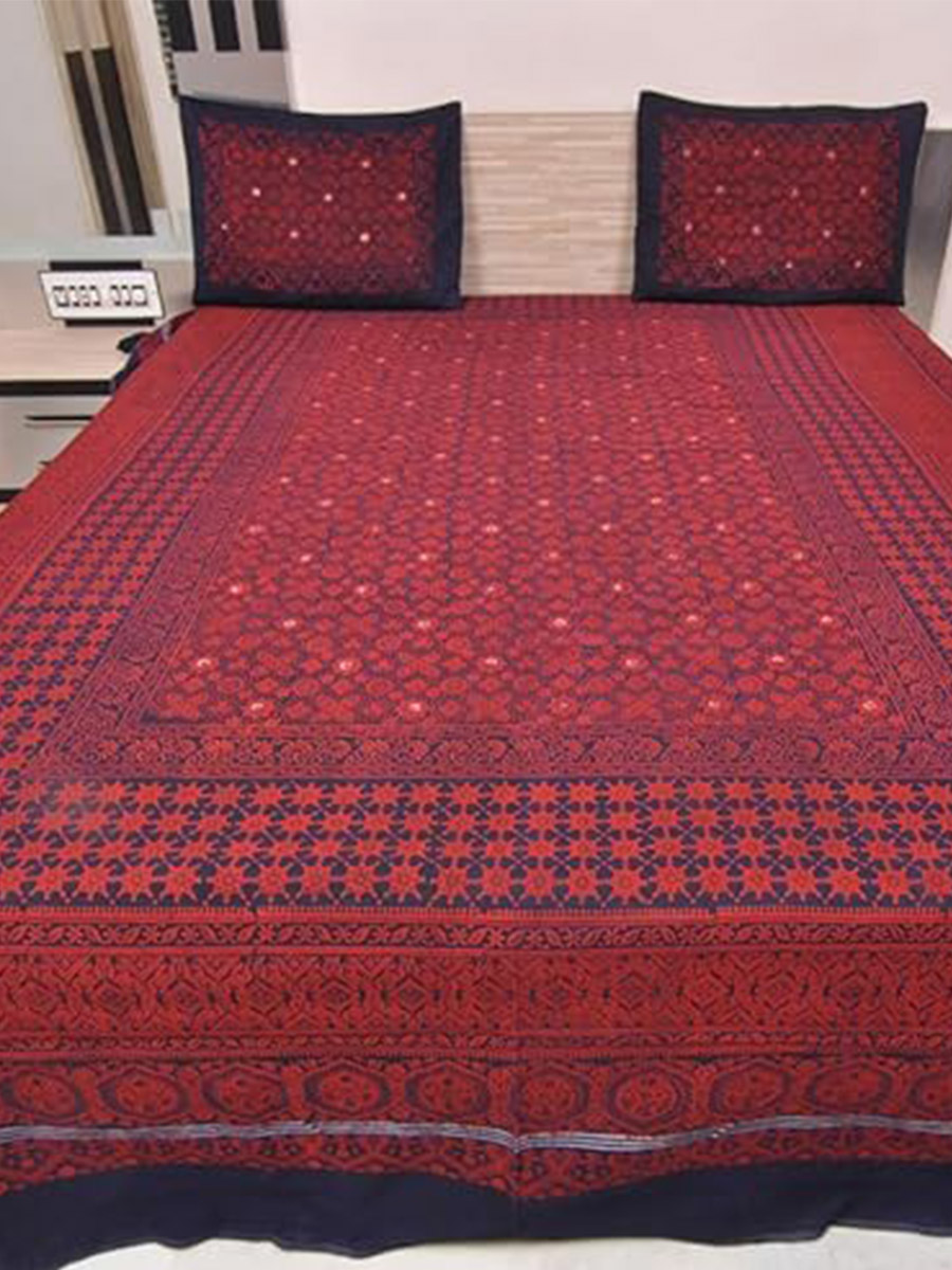 Red & Blue Ajrakh Print Bed Sheet with Pillow Covers | Hand Block Printed Double Bed Cover
