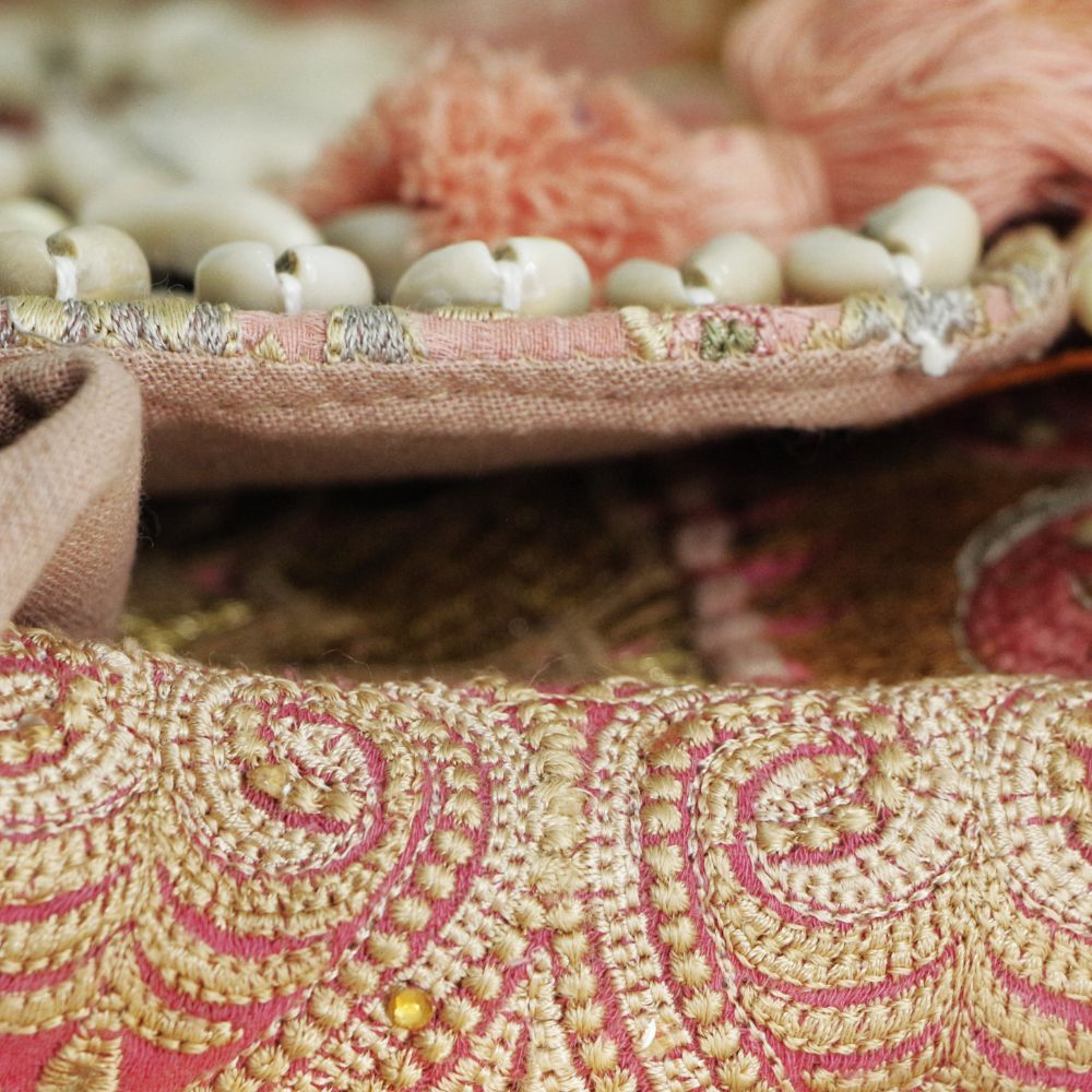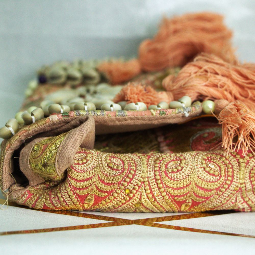 Crafted from old recycled cotton and khadi base fabrics, each piece is carefully chosen for its texture, pattern, and history. The surface is adorned with traditional embroidery, mirrorwork, and patchwork artistry, transforming discarded vintage textiles into a luxury collectible. The use of cowrie shells, once considered symbols of prosperity, adds a cultural and spiritual touch, while the peach tassels create a sense of playfulness and movement.